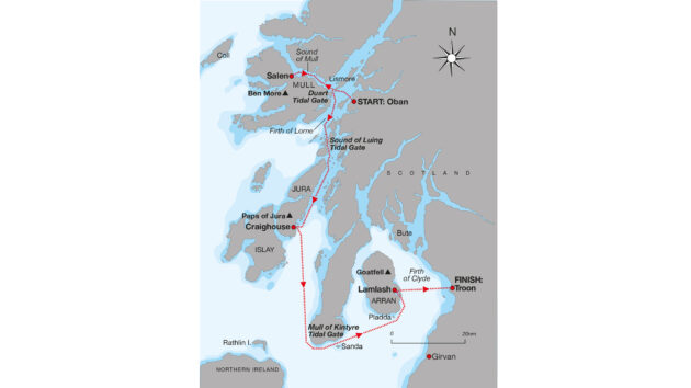 The clue is in the name. The Scottish Islands Peaks Race is from Oban to Troon via three islands – Mull, Jura and Arran, 160 nautical miles. And the peaks? Ben More on Mull, the three Paps of Jura, and Goatfell on Arran – 60 miles of running, 11,500ft (3,500m) of climbing.