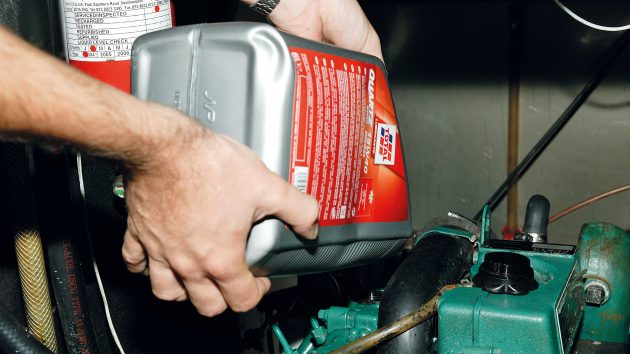 Never exceed the oil change intervals specified in the engine’s handbook. An annual oil change should be the minimum, even with low engine hours. The best time for an annual oil change is just before you lay the boat up for the winter, because then the new oil with its fresh anti-corrosion additives will be in place during the period that the boat is out of use. The oil filter is also normally changed at the same time as the oil.
