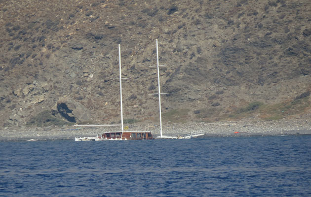 ‘We are on the south side of Kos now, where I took these photos today. There is a similar boat in Lakki and a smaller one at Xerokampos, both Leros. We see abandoned lifejackets frequently on the water.’