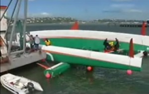 Crew prepare trimaran to be shipped back to France