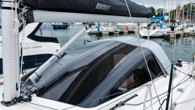 Moving about on deck is easy thanks to wide sidedecks, clear other than for the lower shrouds and with decent moulded bulwarks. Occasionally you need to stand on top of the glass roof to zip up the sail bag, and some grip-tape on the black GRP supports would make this more secure. I’d also spec a grabrail somewhere on the coachroof to aid going forward under way.