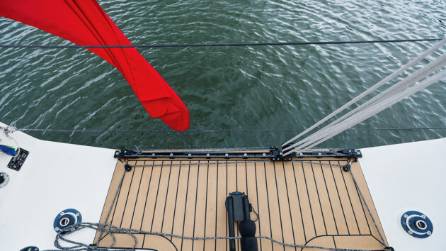 Off the wind, we flew. On a beam reach under plain sail we were nudging over 9 knots – well over hull speed, and sitting consistently between 7.5 and 8.5 knots. The only gremlin here was again our ability to shorten sail. The long boom keeps power well aft in the boat and when there’s too much of it, the sailplan overpowered the rudders and started a gentle round up to windward. Had we had the courage to fly the asymmetric, set from a top-down furler on the end of the retractable carbon bowsprit, or alternatively had the option to reduce mainsail area, the boat would have been far better balanced.
