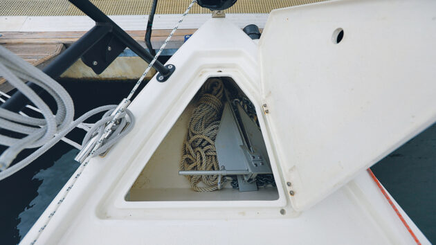 The anchor locker is deep enough for decent ground tackle but lacked a bow roller. Photo: Paul Wyeth