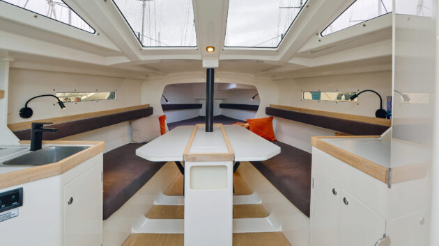 Where this boat stands head and shoulders above any possible competitors is that once down below, she is effectively a deck saloon, given the staggering 200cm of headroom in the galley and heads, with 185cm at the aft end of the saloon table, meaning there is no ducking and peering out of portholes even for tall crew.