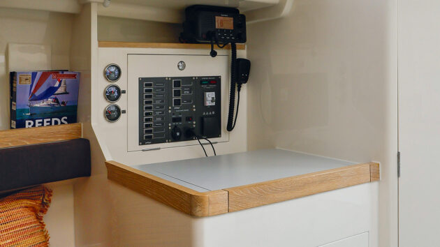 There is plenty of stowage and neat electrical installation above the compact chart table. Photo: Paul Wyeth