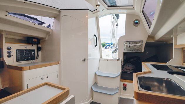 Headroom at the companionway is just massive at 2m. The views and light flooding in are amazing and the oak trim tastefully applied adds a touch of class down below. Photo: Paul Wyeth