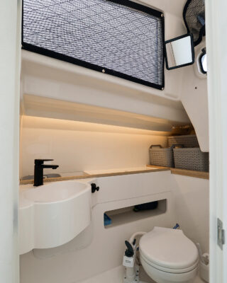 The galley is a decent size too with top opening fridge, single sink, and on this boat, a diesel Wallas cooking plate. The latter is great in that you don’t need gas on board and it takes almost no space, but it does take time to heat up and cool down (the blower lid kit would help make this safer).