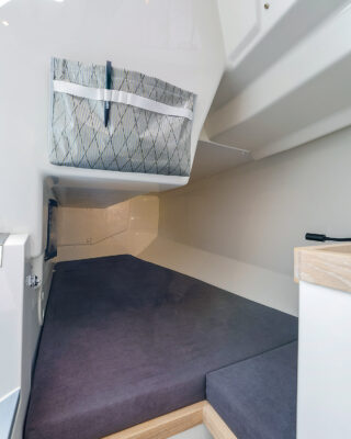 This is thanks to the fact that abaft the keel frames, there is no cabin sole and you stand on the inside of the hull, which is covered in robust but soft foam decking. The low headroom around the saloon doesn’t matter as you’re sitting anyway, and there’s still 95cm of room above the forward berth, plenty for sitting up in bed, though the ring frame here did catch me out once or twice until I got used to it.