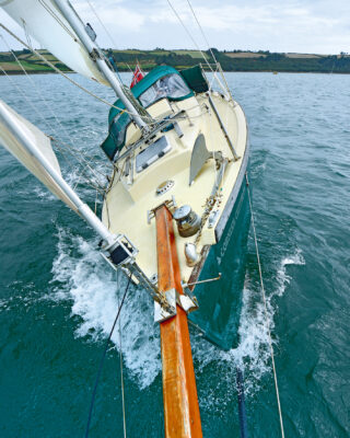 There was a blustery Force 4-5 blowing when we set off from St Just under full sail. Straight away I was impressed that Chip was confident enough not to bother with a reef, something that would have been risky with the old Mk1. And sure enough we were soon heeling over dramatically as Chip hung on to full sail, not even bothering to luff up in the gusts. Okay, it wasn’t exactly storm conditions and the sea was pretty flat on the Carrick Roads, but the boat seemed to lap it up.