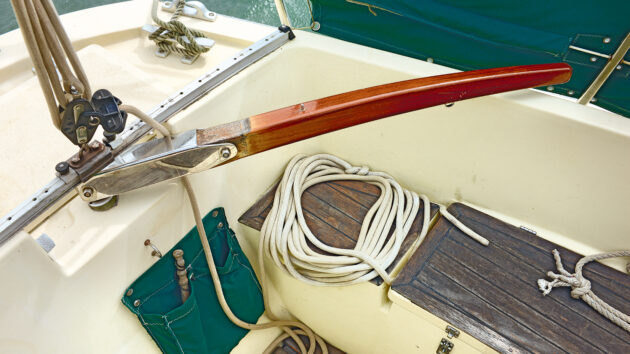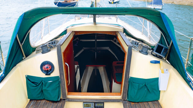 On board, the cream-coloured deck moulding with plenty of wood trim – including teak decking in the cockpit – gave the boat a salty feel. The deep coamings imbued the cockpit with a sense of security and spoke of a boat designed to take a few waves without complaint. And the counter stern proved to be practical as well as pretty, creating a small aft deck with a dinky lazarette, just big enough to house two gas cylinders.