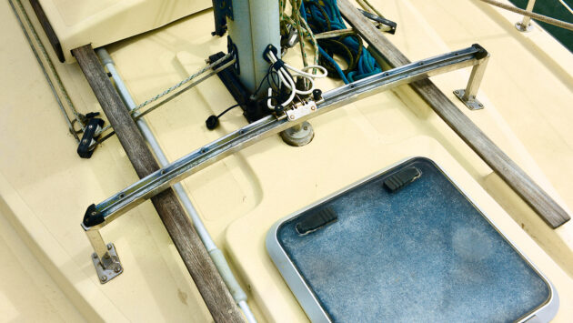 The table slides up and down the stainless steel mast support so that it can be used as an infill, turning the settee into a large double bed. Some versions of the boat have a hinged bulkhead forward, which folds down and turns into a double berth, overhanging the front end of the saloon berths – perfect for kids. The bulkhead was fixed on Chip’s boat, creating a large stowage area instead.