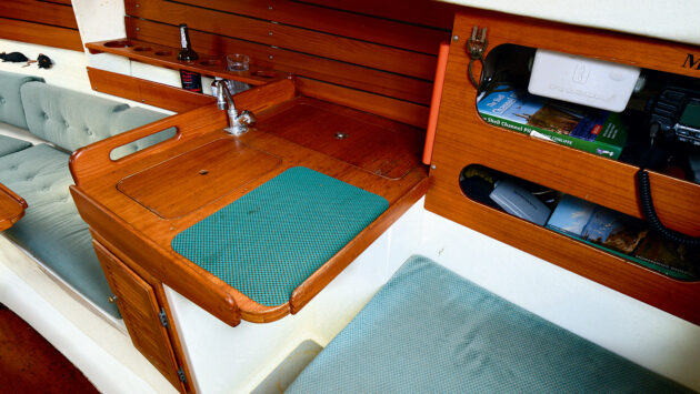 Aft of the saloon, there’s a galley to port and chart table over a galley sink to starboard. And, a real improvement on the old Mk1 with its crappy chemical toilet, there’s a fully enclosed marine heads aft of the galley. With a quarter berth aft of the chart table, Chip’s boat had three berths, although four- and five-berth versions were also available.