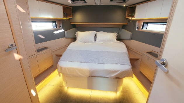 I’d imagine charter companies will take five cabins, in which the forward cabin is split into two and is still wide enough for each to have a proper double berth (205cm×165cm) and ensuite heads. In this scenario, the main heads aft port becomes a bunk cabin. In the three-cabin layout that I think most private owners would go for, the huge forward cabin features a large island bed (215cm×177cm) with a stunning wraparound headboard. It has separate shower and toilet compartments, with acres of locker space.