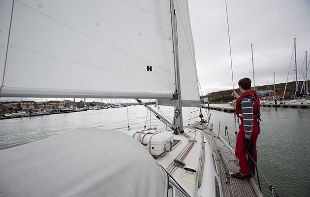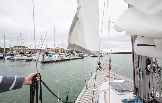 Having sailed upwind with plenty of space, drop the main before lining up for the approach