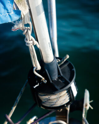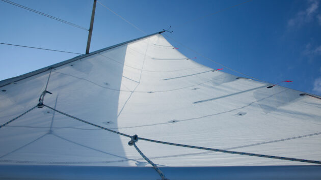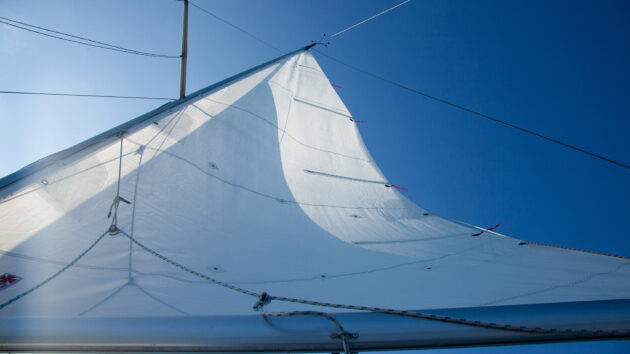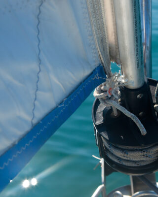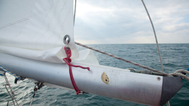 It’s vital that the leech pennant pulls the clew both aft and down to ensure a tight foot. This one is slightly improvised, but it works.