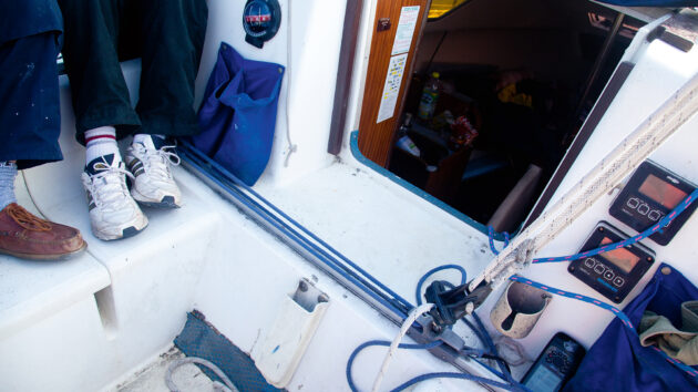 When a boat becomes over-powered and starts to heel too far, it helps to drop the car down the track. If there’s no track, keep the kicker tight and ease the mainsheet.