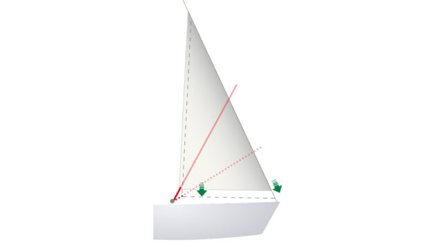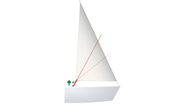 Here the topping lift hasn’t been released, so the boom cannot tension the leech (an oversight in this instance, but commonly seen). The sail is also too full, contributing to excessive heeling force and too little lift.