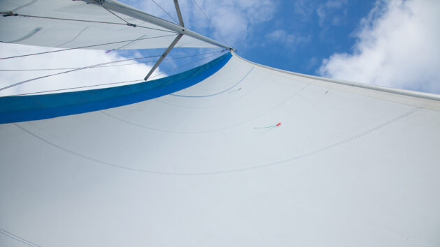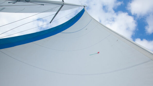 The view from below clearly shows the more open ‘slot’ between the headsail and mainsail. One effect is less back-winding in the mainsail.