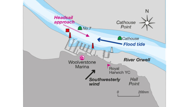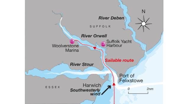 In terms of getting an engineer on board, the closer they can get to a marina the better, although a mooring buoy or anchorage from which they could arrange a tow would do fine if that’s not feasible. My preference would be to continue up the Orwell, which runs north and then north-west, so it should be an easy point of sail especially considering that, by this time, the tide will be on the flood.