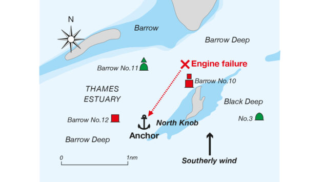 Jenny and James, who both hold the RYA Yachtmaster Coastal qualification, are en route to St Katharine Docks in London aboard their Westerly Oceanranger 38. They’re motoring up the Thames Estuary when the engine fails. With a light southerly they manage to hoist sails and ghost to the edge of the Barrow Deep, anchoring just west of North Knob.